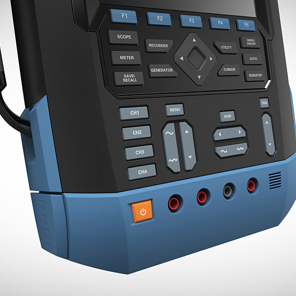 - 功能視覺分區(qū):通過形態(tài)與色彩明確操作邏輯 —— 頂部高清波形顯示區(qū)、中部密集按鍵交互區(qū)、底部接口測(cè)試區(qū)、背部支撐維護(hù)區(qū),讓操作人員快速識(shí)別 “觀測(cè) – 操作 – 連接 – 支撐” 全流程,降低現(xiàn)場(chǎng)操作門檻;